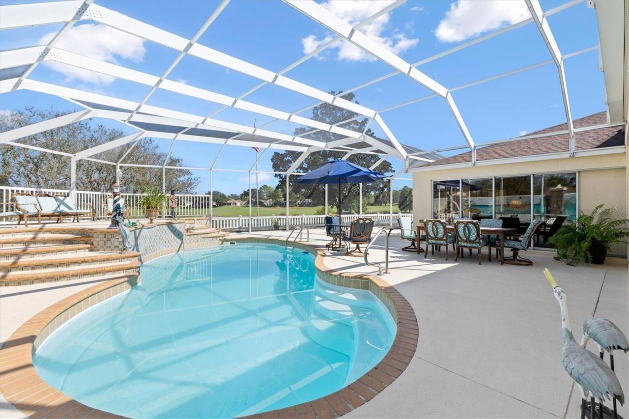 BIRDCAGE RESCREENED (2025) NEW ROOF (2020) NEW HVAC IN MAIN LIVING AREA (2026)! Perched high above the #1 Tee box of the Erinn Glenn 9 hole course of the renowned NANCY LOPEZ CHAMPIONSHIP GOLF COURSE, this extraordinary residence in THE VILLAGES, FLORIDA offers water and fairway views that inspire pure tranquility. NO BOND! From the moment you arrive, it's clear there is no other home quite like this one. Its elevated position, thoughtful design, breathtaking vistas make it a rare find. Inside, ...BIRDCAGE RESCREENED (2025) NEW ROOF (2020) NEW HVAC IN MAIN LIVING AREA (2026)! Perched high above the #1 Tee box of the Erinn Glenn 9 hole course of the renowned NANCY LOPEZ CHAMPIONSHIP GOLF COURSE, this extraordinary residence in THE VILLAGES, FLORIDA offers water and fairway views that inspire pure tranquility. NO BOND! From the moment you arrive, it's clear there is no other home quite like this one. Its elevated position, thoughtful design, breathtaking vistas make it a rare find. Inside, sophistication meets comfort in a layout that seamlessly blends elegance with versatility. The main home features 3 spacious bedrooms and a beautifully updated Kitchen appointed with NEW GE Profile smart appliances, pull-out shelving, large walk-in pantry, under cabinet lighting, and custom pot drawers. The adjoining Dining and Living areas flow effortlessly together, enhanced by ENGINEERED HARDWOOD Flooring and expansive sliding glass doors that fully recede, opening to panorama views of the golf course, wrap around birdcage, custom designed POOL with GAS HEAT PUMP, creating a true indoor/outdoor living experience. The Primary suite is a serene retreat, with a bay window perfectly framing the #1 green and glistening water. The ensuite bath includes dual vanities and a generous walk-in closet, while each sunrise brings a new display of color across your private sanctuary. The 2nd bedroom features a large walk-in closet, and the 3rd bedroom includes a closet and a safe that will convey with the home. Designed with entertaining in mind, the 'PARTY ROOM is an impressive showpiece, fully furnished and complete with a custom-built bar and overhead projector. Whether hosting intimate gatherings or lively celebrations, this space offers both flexibility and flair. With its own FULL BATH, ample storage, and direct access to the screened pool and birdcage area through receding sliding doors, this area of the home could easily serve as an INDEPENDENT GUEST SUITE OR MULTIGENERATIONAL LIVING SPACE. Garage apartment further expands the home's versatility, Featuring a MURPHY BED, Cabinetry, QUARTZ countertops, sink, refrigerator, microwave, overhead door, and a PRIVATE ENTRANCE through the courtyard. Currently showcased with a full-size pool table and slot machines, it provides endless options for recreation, hobbies, or private guest accommodations. Additional Features include TWO HVAC systems, a whole-home water treatment system, whole house central vacuum system, surround sound system, TILE FLooring throughout secondary spaces, and a well-appointed laundry room with a wall-mounted ironing board, solar tube, oversized walk-in storage room. The birdcage was RESCREENED in (2025), NEW ROOF (2020), NEW HVAC in main part of home (2026). Throughout the home you'll find AMPLE CLOSETS and thoughtfully designed storage spaces. Every detail of this residence has been crafted to elevate daily living, where each SUNRISE over the fairway feels like a private celebration of light and serenity. Nestled within The Villages, a premier golf cart community where leisure, comfort, and luxury intertwine, this remarkable home embodies resort-style living at its finest! Maintenance free yard, a short distance to the Legacy pool and famous Nancy Lopez Country Club for dining, medical, banking, retail stores and VA clinic all just a short, pleasant golf cart ride away. This is truly a MUST-SEE home to fully appreciate its beauty and uniqueness! ALL furnishings available.